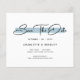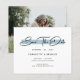 Budget Modern Minimalist Script Save The Date Invitation Card features "Save The Date" in an elegant black script over a modern blue accent on a white background with your Save The Date information below. Personalise by editing the text in the text boxes provided and adding your favourite photo to the reverse. Designed for you by ©Evco Studio www.zazzle.com/store/evcostudio