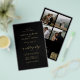Elegant simple minimalist romantic budget affordable all in one RSVP and guest details black wedding invitation paper flyer template featuring a classy stylish chic trendy faux gold handwritten calligraphy script, a scanning QR CODE (automatically generated with your website link), and 4 custom photo collage. ++++++++++++ Easy to personalise with your engagement pictures and details on both sides! The invitation is suitable for spring summer autumn fall and winter modern trendy stylish weddings. +++++++++++++++++++++++++ PLEASE READ THIS BEFORE PURCHASING! This is a low budget affordable wedding invitation printed on a FLYER (advertising type paper). ++++ Please note that BUDGET PAPER IS THIN - You can upgrade to have this card printed on cardstock ++++ ENVELOPES NOT INCLUDED.