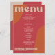 Abstract shapes retro vintage 70s style unique budget affordable wedding menu card with bold typography in a vibrant trendy modern red, beige tan and orange terracotta boho chic color palette. +++++++ Please note that all the colors are changeable. ++++++++++++ Suitable for informal casual stylish contemporary weddings.