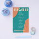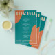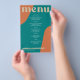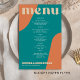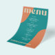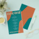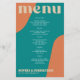Abstract shapes retro vintage 70s style unique cheap budget wedding menu template flyer (advertising type of paper) with bold typography in a vibrant trendy modern teal, beige tan and orange chic color palette. +++++++ Please note that all the colors are changeable. ++++++++++++ Suitable for informal casual stylish contemporary weddings. ++++++++++++++++ PLEASE READ THIS BEFORE PURCHASING! This is a cheap budget wedding card printed on a FLYER (advertising type of paper suitable for folded mailings). ++++ Please note that BUDGET PAPER IS THIN - You can upgrade to have this card printed on cardstock ++++ ENVELOPES NOT INCLUDED. +++ Double-check all the information and spelling of your text because you will receive exactly what you see - no one else will check anything before printing.