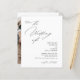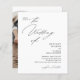 The wedding invitation features a minimalist, elegant design with a clean white background and a combination of modern script and serif fonts. The front side includes a request to join the celebration, with "The Wedding of" in a prominent cursive style, followed by the couple's names in bold serif font and details of the event in a clear, straightforward format. The back showcases a arch photo of the couple than can be customise, with text for RSVP details in matching script and a qr code.