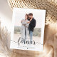 Simple and elegant, this photo engagement announcement budget card is the perfect way to let your family and friends know the good news before you have a wedding date set. The card features a photo on a clean white background with the names of the couple and the date and place they got engaged, and a trendy script font announcing the “beginning of forever.” The back is blank for versatility.