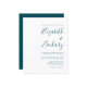 This simple modern wedding invitation features teal blue text on a white background. Add the names of the bride and groom in stylish handwriting calligraphy and the details in sans serif font. The reverse side is a matching shade of solid teal. NOTE: Envelopes are not automatically included with these budget invitations, so please remember to choose the "white envelopes" option!