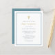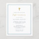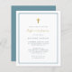 Simple first communion invitations featuring faux gold foil cross and calligraphy with elegant modern typography on a white background with a blue border. As part of the budget selection here on Zazzle, these invitations come in limited sizes and paper stocks. If you need a different size or paper stock, this design can be transferred to a standard 5x7 format using the design transfer tool for more options.