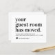 Your Guest Room Has Moved Moving Announcement featuring a modern script and font typography and a heart. The colours can be changed easily by clicking personalise and then click to customise further to view our colour picker. Contact our shop if you require help.