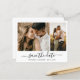 Budget Minimalist Elegant Modern Typography Script 2 Photo Collage Save The Date Cards in black and white. This romantic delicate design perfect for modern wedding. Features 2 grid photo collage, a whimsical calligraphy in hand lettered style swash tail font calligraphy or typography script and a love heart. Easy to personalise it with your wedding details and pictures. Low budget affordable cheap save the date wedding cards.