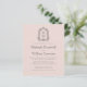 This elegant vintage-inspired wedding invitation design features a pair of charcoal grey monogram initials in open serif font above and below a dividing line and encircled by a line art botanical crest on a blush pink background. The back of the card is solid blush.