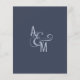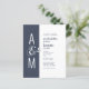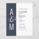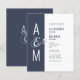 Budget wedding invitation. Modern simple geometric wedding design. Dark blue-ish grey and white. Bold and elegant typography. Bride’s and Groom’s monograms and a big ampersand as a symbol of unity.