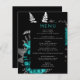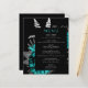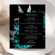 This elegant, moody wedding menu features a lush, romantic floral bouquet in teal blue with silver faux foil and glitter foliage on a black background. Customise the silver grey text in stylish fonts on a black rectangle. The back of the card is solid black.
