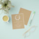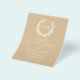 A coral wreath frames the monograms of the bride and groom at the top of this budget minimal beige sand coloured coastal invitation with white text.