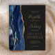 The left-hand edge of this elegant modern wedding invitation features a navy blue watercolor agate border trimmed with faux gold glitter. The customisable text combines gold coloured handwriting, copperplate and italic fonts on a dark charcoal grey background. The reverse side features a matching navy blue and gold agate design. NOTE: Envelopes are not automatically included with these budget invitations, so please remember to choose the "white envelopes" option!
