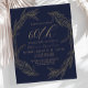 This sophisticated 60th (or edit to any year) birthday party invitation features a gold line art drawing of a foliage wreath on a navy blue background. The number "60th" and the name of the guest of honour appear in elegant gold-coloured handwriting script, with the rest of the customisable text in sans serif font. The back of the card is solid navy blue.