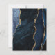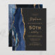The left-hand edge of this elegant modern 50th birthday party invitation features a navy blue watercolor agate border trimmed with gold faux glitter. The customisable text combines gold-coloured handwriting, copperplate and italic fonts on a slate black background. The reverse side features a matching navy blue and gold agate design.