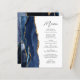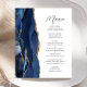 The left-hand edge of this elegant modern wedding menu features a navy blue watercolor agate design trimmed with faux gold glitter. The customisable text combines charcoal grey handwriting script and sans serif fonts on a white background. The navy blue and gold agate design is repeated on the reverse side.