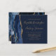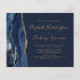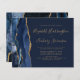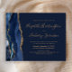 The left-hand edge of this elegant modern wedding invitation features a navy blue watercolor agate border trimmed with faux gold glitter. The customisable text combines gold-coloured handwriting, copperplate and italic fonts on a navy blue background. The reverse side features a matching navy blue and gold agate design.