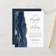 The left-hand edge of this elegant modern wedding invitation features a navy blue watercolor agate border trimmed with faux gold glitter. The customisable text combines charcoal grey handwriting, copperplate and italic fonts on a white background. The back is solid dark navy blue. NOTE: Envelopes are not automatically included with these budget invitations, so please remember to choose the "white envelopes" option!