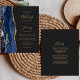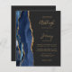 The left-hand edge of this design features a navy blue watercolor agate border trimmed with gold faux glitter. The customisable text combines gold-coloured handwriting, copperplate and italic fonts on a slate black background. The reverse side provides space for additional wedding details on a solid slate black background.