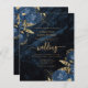 This elegant wedding invitation features blue floral bouquets set off with gold faux foil greenery in two corners, on a background image of navy blue watercolor agate. The customisable text combines gold-coloured serif, italic and handwriting fonts. The reverse side features a matching navy blue and gold floral and agate design.