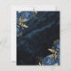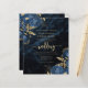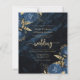 This elegant wedding invitation features blue floral bouquets set off with gold faux foil greenery in two corners, on a background image of navy blue watercolor agate. The customisable text combines gold-coloured serif, italic and handwriting fonts. The reverse side features a matching navy blue and gold floral and agate design.