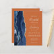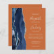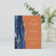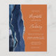 The left-hand edge of this elegant modern wedding invitation features a navy blue watercolor agate border trimmed with faux silver glitter. The customisable text combines handwriting, copperplate and italic fonts in light silver grey on an orange background. The reverse side provides space for wedding details on a solid orange background, along with a QR code guests can scan to visit your website and RSVP, which saves the cost of printing and mailing separate RSVP