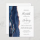 The left-hand edge of this elegant modern wedding invitation features a navy blue watercolor agate border trimmed with faux rose gold glitter. The customisable text combines handwriting, copperplate and italic fonts in charcoal grey on a white background. Add additional details on the back, along with a QR code to help your guests visit your wedding website.