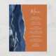 The left-hand edge of this elegant modern wedding menu features a navy blue watercolor agate border trimmed with faux silver glitter. The customisable text combines handwriting and copperplate fonts in silver grey on a burnt orange background. The reverse side features a matching navy blue and silver agate design.