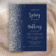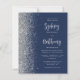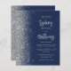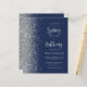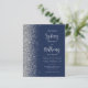 The left-hand edge of this elegant modern wedding invitation features a silver faux glitter border. The customisable text combines pale silver grey calligraphy script and sans serif font on a navy blue background. The reverse side features a matching navy blue and silver design.