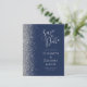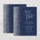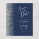 The left-hand edge of this elegant modern wedding save the date card features a silver faux glitter border. The customisable text combines silver grey handwriting and copperplate fonts on a navy blue background. The reverse side features a matching navy blue and silver design.