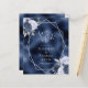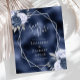 This elegant modern wedding save the date card features a silver geometric frame decorated with dusty blue and navy blue floral bouquets on a navy blue faux foil background. The customisable text combines silver grey whimsical handwriting, copperplate and italic fonts.