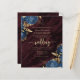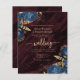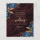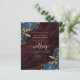 This elegant wedding invitation features navy blue floral bouquets set off with gold faux foil foliage in two corners, on a background image of burgundy watercolor agate. The customisable text combines gold-coloured serif, italic and handwriting fonts. The reverse side provides space for wedding details, along with a QR code guests can scan to visit your website and RSVP, which saves the cost of printing and mailing separate RSVP cards.