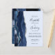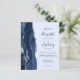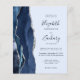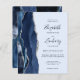 The left-hand edge of this elegant modern wedding invitation features a navy blue watercolor agate border trimmed with faux silver glitter. The customisable text combines handwriting, copperplate and italic fonts in navy blue on a pale blue background. The reverse side features a matching navy blue and silver agate design.