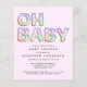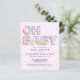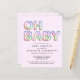 This budget-friendly pink minimal modern baby girl shower invitation features "OH BABY" written in illustrations of balloons in a rainbow of paste, blue, green, pink, purple and orange.