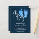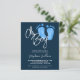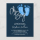 These modern budget baby shower invitations are decorated with Oh Boy! in stylish script typography and cute watercolor baby's feet in pastel blue on a navy blue background.