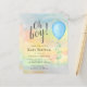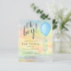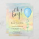 This budget boy's Baby Shower Invitation is decorated with a watercolor blue balloon and green eucalyptus on a colourful sky background and says "Oh Boy!"