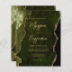This elegant wedding invitation features a background image of olive green watercolor agate trimmed with faux gold glitter. The customisable text combines gold-coloured modern handwriting, copperplate and italic fonts. The reverse side provides space for wedding details on a matching green agate background, along with a QR code guests can scan to visit your website and RSVP, which saves the cost of printing and mailing separate RSVP cards.