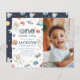 One small step! A cute birthday party budget invitation with hand-painted watercolor animals floating around in space. On the left-hand side of the card, there is a frame with a cat astronaut holding a flag, a dog astronaut and a giraffe astronaut, aliens in UFOs, a rocket ship, planets, stars, and more! On the right-hand side, there is a custom photo of your choice. The cards reverse to a fun pattern of the space animals against a dark blue background. Celebrate your little one's first trip around the sun with this space-themed birthday party invitation. Drop me a message if you'd like me to change the wording to "two the moon" or any other age theme! As part of the budget selection on Zazzle, this sheet isn't a standard invite size or paper quality. If you want this design on an invitation card you can find it in the collection or use the Zazzle Make Machine to transfer it onto the product of your choice. View the collection linked on this page for matching items or visit our store for more designs!