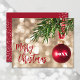 Small elegant 4.5" x 5.6" flat greeting card features a red Christmas tree ornament against gold blurred lights and the words Merry Christmas on the front, and your personal holiday greeting and names on the back. These affordable greeting cards are printed on 110 lb paper available in 3 sizes. **WHITE ENVELOPES ARE OPTIONAL ON ORDER PAGE. Be sure to double-check your order before adding it to your cart as what you see on the screen is what will be printed. The Live Design Service can help you with your design layout if needed.