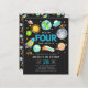 Modern Outer Space Galaxy Moon Rocket Spaceship Alien Kid Reach FOUR the Stars 4th Birthday Black Grey Invitation