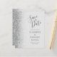 The left-hand edge of this elegant modern wedding save the date card features a silver faux glitter border. The customisable text combines charcoal grey handwriting and copperplate fonts on a pale grey background. The reverse side features a matching grey and silver design.