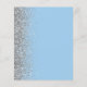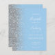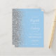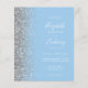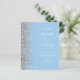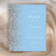 The left-hand edge of this elegant modern wedding invitation features a silver faux glitter border. The customisable text combines white handwriting, copperplate and italic fonts on a pastel baby blue background. The reverse side features a matching baby blue and silver design.