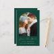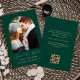 This simple, minimalist Save the Date card features a photo arch above the words "Save the Date" in elegant gold-coloured handwriting script, followed by the couple's names, wedding date and city in sans serif font on an emerald green background. Add a more detailed message with additional information on the back, along with a QR code your guests can use to visit your wedding website.