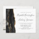 The left-hand edge of this elegant modern wedding invitation features a black watercolor agate border trimmed with faux gold glitter. The customisable text combines charcoal grey handwriting, copperplate and italic fonts on a white background. Easily replace the sample image on the back with your own horizontal photo.
