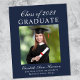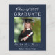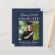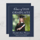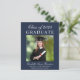 Budget-friendly dark blue college graduation announcement featuring the graduate's photo, his or her name and class year in an elegant white script and his or her university, major and honours in modern white typography.