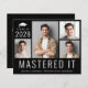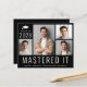 Budget-friendly masters degree black graduation announcement and party invitation featuring a 4 picture photo collage, "Mastered It" written across the bottom in large white letters and his or her class year, name and college or university in simple white typography. On the reverse side, add the graduation party details.