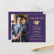 Elegant budget-friendly purple college graduation announcement featuring a gold grad cap, a photo of the graduate, and their name in classic gold serif typography. Add their school, major, honours or future plans. This budget semi-gloss paper is similar in weight to photo paper -- a larger 5x7 traditional card stock version is also available (message us for the link).