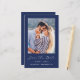 This simple, minimalist Save the Date card features a vertical photo above the words "Save the Date" in elegant white handwriting script, followed by the couple's names, wedding date and city in sans serif font on a navy blue background. Add a more detailed message with additional information on the reverse, along with a QR code to help your guests visit your wedding website.