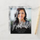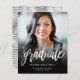 Modern graduation announcement featuring a custom vertical photo. The word "graduate" appears in silver faux foil script, with the graduate's name, school, and year of graduation below in silver grey sans serif font. Easily replace the sample image with your own graduate's photo. A black gradient screen helps ensure the text pops. The reverse features a pattern of silver faux foil and faux satin stripes. Ideal for high school or college graduation.