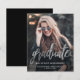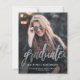 Modern graduation announcement featuring a custom vertical photo. The word "graduate" appears in silver faux foil script, with the graduate's name, school, and year of graduation below in white sans serif font. Easily replace the sample image with your own graduate's photo. A black gradient screen helps ensure the text pops. The reverse is solid black. Ideal for high school or college graduation.