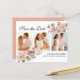 Three of your couple's photos are placed in a band at the centre of the save the date card. Dusty pink roses on sage green eucalyptus leaves provide a diagonal floral accent. Save the Date is written in a formal script in the upper right corner. Your names, wedding date and location are in the bottom right corner.