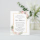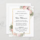 Blush pink roses and white hydrangea flowers create beautiful floral arrangements. They decorate a gold frame that surrounds your bridal shower details. The back of the bridal shower invitation is white.